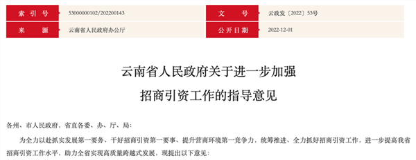 长沙并不是近期唯一出台招商引资新政的地区。12月1日,云南宣布出台《云南省人民政府关于进一步加强招商引资工作的指导意见》,希望进一步提高云南招商引资工作水平,助力全省实现高质量跨越式发展。