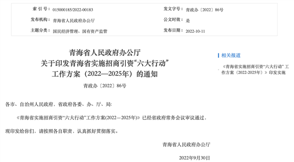而在10月11日,青海也正式印发实施《青海省实施招商引资“六大行动”工作方案(2022-2025年)》。该方案提出,力争每年签约招商引资额1000亿元以上,落实招商引资项目170个以上,其中,100亿元以上项目2个以上,项目履约率90%、开工率70%、资金到位率40%以上,实现招商引资对全省经济社会发展的推动和支撑作用显著增强的目标。