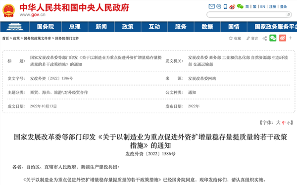 10月13日,经国务院同意,国家发展改革委、商务部、工业和信息化部、自然资源部、生态环境部、交通运输部联合印发了《关于以制造业为重点促进外资扩增量稳存量提质量的若干政策措施》,以进一步扩大外资流入,稳定外商投资规模,提高利用外资质量,更好发挥利用外资促进我国制造业高质量发展、更深融入全球产业链供应链的积极作用。