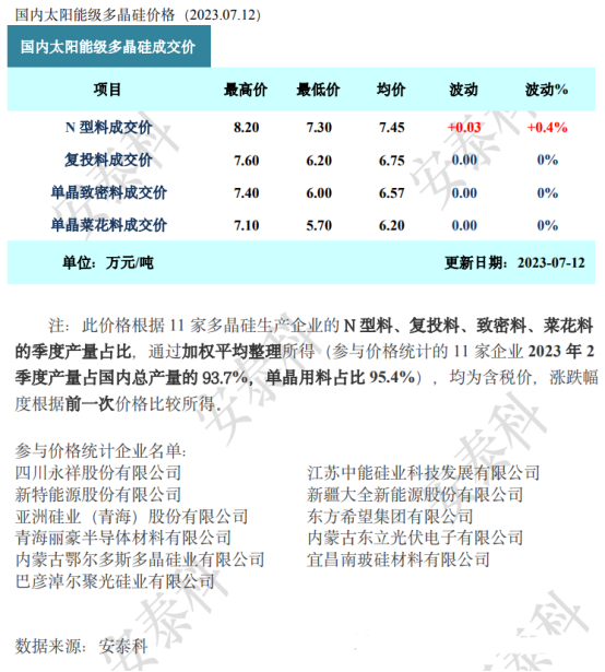 网络整理 2025-09-02证券之星光伏行业周报:中国有色金属工业协会硅业分会数据显示,本周多晶硅市场N/P价差扩大,整体持稳微涨。国金证券最新观点指出,硅料价格明确触底后,由下游快速增长的N型电池产能释放所驱动的上涨和分化,随下半年N型电池产能加速释放。宏观方面,国家发展改革委、国家能源局、国家乡村振兴局关于实施农村电网巩固提升工程的指导意见,文件指出,因地制宜通过合理配置分布式光伏和风电等建设改造可再生能源局域网。企业方面,晶澳科技发布公告称,公司本次向不特定对象发行可转换公司债券募集资金总额不超过896030.77万元,加码垂直一体化产能建设。亿晶光电发布业绩预增公告,预计2023年半年度实现营业收入约44亿元,较上年同期增加约27%;归母净利润2.80亿元到3.20亿元,同比增加1086%到1255%。