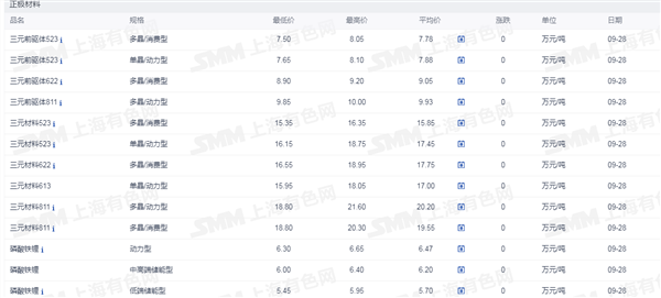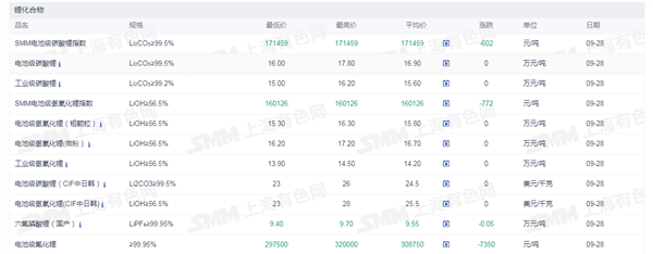 网络整理 2025-09-02证券之星新能源车行业周报:据上海有色网,截止9月28日,电池级碳酸锂16-17.8万元/吨,均价16.9万元/吨,环比上一工作日持平;工业级碳酸锂15-16.2万元/吨,均价15.6万元/吨,环比上一工作日持平。今日已是国庆小长假前的前夕,下游多数厂家已于前期完成节前小幅补库,当前市场总体成交依旧偏淡。