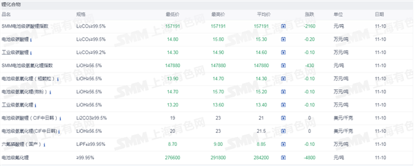网络整理 2025-09-02证券之星新能源车行业周报:据上海有色网,截止11月10日,电池级碳酸锂14.8-15.8万元/吨,均价15.3万元/吨,环比上一工作日下滑0.2万元/吨;工业级碳酸锂14.3-14.9万元/吨,均价14.6万元/吨,环比上一工作日下滑0.1万元/吨。上游锂盐企业更多以长单出售为主,挺价心态依旧,但个别锂盐企业随行就市小幅下调出售价格,下游正极材料企业出于降本增效策略,其散单拿货情绪也依旧低迷,近期碳酸锂现货市场成交价格仍呈现下行趋势。