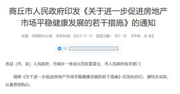 11月13日,商丘印发《关于进一步促进房地产市场平稳健康发展的若干措施》的通知,共提出23条措施。