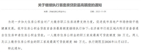 11月9日,济南发布继续执行首套房贷款最高额度的通知,其中首套房公积金贷款,一人缴存职工家庭最高可贷款额度50万元,两人及以上缴存职工家庭最高可贷款额度80万元。执行期限延长至2026年11月12日。