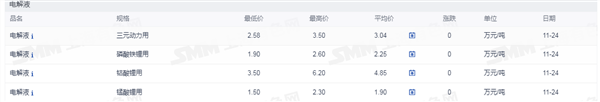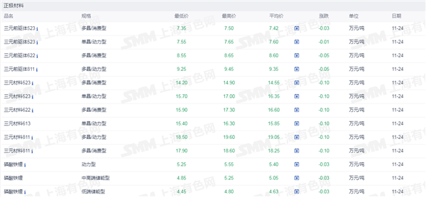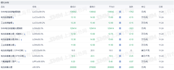 网络整理 2025-09-02证券之星新能源车行业周报:据上海有色网,截止11月24日,电池级碳酸锂13.1-14.5万元/吨,均价13.8万元/吨,环比上一工作日下滑0.15万元/吨;工业级碳酸锂12.2-13.4万元/吨,均价12.8万元/吨,环比上一工作日下滑0.15万元/吨。今日锂盐企业延续挺价出售散单的态度,依然以长单出货为主;而在近期碳酸锂现货价格连续下跌后,下游少部分正极材料企业采买情绪略微转变,个别正极材料企业在现货价格低位时期进行少量采买,但整体现货市场的散单成交量级仍较平淡,并未出现明显放量情况。