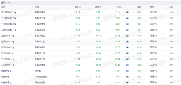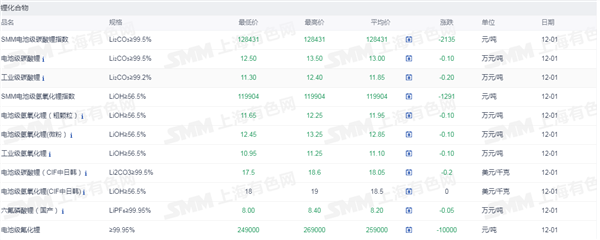 网络整理 2025-09-02证券之星新能源车行业周报:据上海有色网,截止12月1日,电池级碳酸锂12.50-13.50万元/吨,均价13.00万元/吨,环比上一工作日下滑0.10万元/吨;工业级碳酸锂11.30-12.40万元/吨,均价11.85万元/吨,环比上一工作日下滑0.20万元/吨。供应端,近期部分上游大厂开始逐步放出前期储备库存,锂盐市场流通有所增量,但当前下游采买需求依旧疲软,供强需弱之下,市场看跌情绪依旧浓重,价格承压下行。
