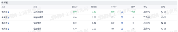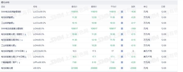 网络整理 2025-09-02证券之星新能源车行业周报:据上海有色网,截止12月8日,电池级碳酸锂11.2-12.5万元/吨,均价11.85万元/吨,环比上一工作日下滑0.2万元/吨;工业级碳酸锂10.15-10.9万元/吨,均价10.53万元/吨,环比上一工作日下滑0.17万元/吨。12月8日市场中锂盐企业的出货情绪抬升,个别锂盐企业和正极材料以11.2万元/吨价格成交较多的电池级碳酸锂,而盐湖企业和回收锂盐企业观望情绪抬升,并无明显出货打算。近期正极材料企业询价和拿货意愿更为积极,但由于贸易企业盘面套保难以平仓而限制其销售碳酸锂现货,正极材料更多偏向于向锂盐企业采购。但目前正极材料企业反馈其订单无明显增量迹象,其在进行采购并补充碳酸锂原料库存后,对于碳酸锂的采购或也难有持续大幅放量的情况出现。