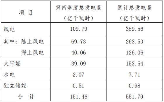 2023年累计总发电量551.79亿千瓦时,较上年同期增长14.12%。其中,风电完成发电量389.56亿千瓦时,较上年同期增长14.75%(陆上风电完成发电量263.50亿千瓦时,较上年同期增长16.53%;海上风电完成发电量126.06亿千瓦时,较上年同期增长11.21%);太阳能完成发电量153.54亿千瓦时,较上年同期增长14.23%;水电完成发电量7.71亿千瓦时,较上年同期下降16.20%;独立储能完成发电量0.98亿千瓦时,较上年同期增长139.02%