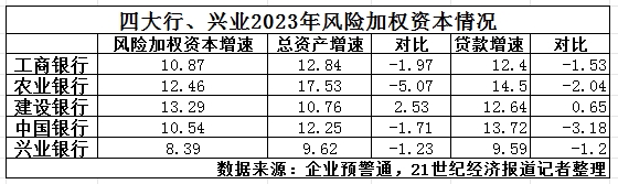 工商银行表示,2023年该行建立健全资本精益化管理,不断完善资本的科学筹集、高效配置、精准计量、长效约束、常态优化管理机制,持续提升资本使用效率;农业银行表示,该行围绕资本集约式发展要求,充分发挥资本对业务的约束和引导作用,强化资本约束和价值回报管理,完善资本管理长效机制;中国银行表示,该行持续强化内部管理,风险加权资产增速慢于资产增速;兴业银行表示,该行合理安排风险加权资产规模总量,优化风险加权资产额度分配和管控机制,将有限的资本资源向绿色、普惠小微、新赛道及符合“四个重点”策略的客户、行业、区域倾斜,促进资本使用效率不断提升。