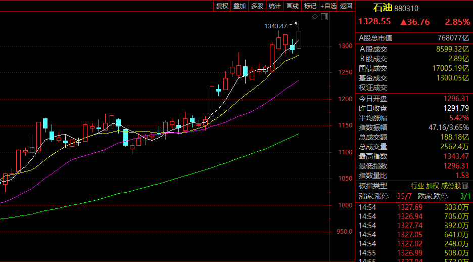 AH能源股联袂走强,A股石油板块指数最高涨近4%,创2015年6月以来,近9年新高。通源石油、潜能恒信20%涨停,准油股份、和顺石油等涨停或涨超10%。中国海油创历史新高,中国石油创近9年新高。