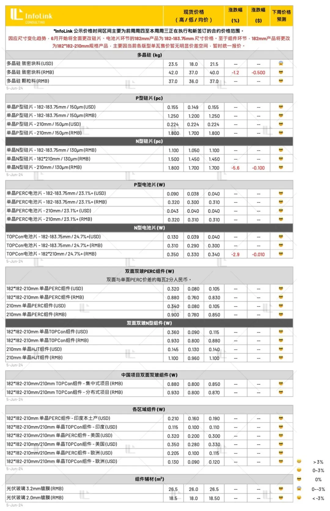 本周项目观望情绪较重,并无太多订单执行,本周价格暂时平稳,TOPCon 组件价格大约落于 0.88-0.90 元人民币,项目价格开始朝向 0.9 元人民币以下。低价抢单、低效产品价格快速下探,每瓦 0.74-0.78 元人民币的价格也可看见,但因项目并非正常效率与订单模式将会剔除现货表采集样本,因此本周低价并无列示该价格。