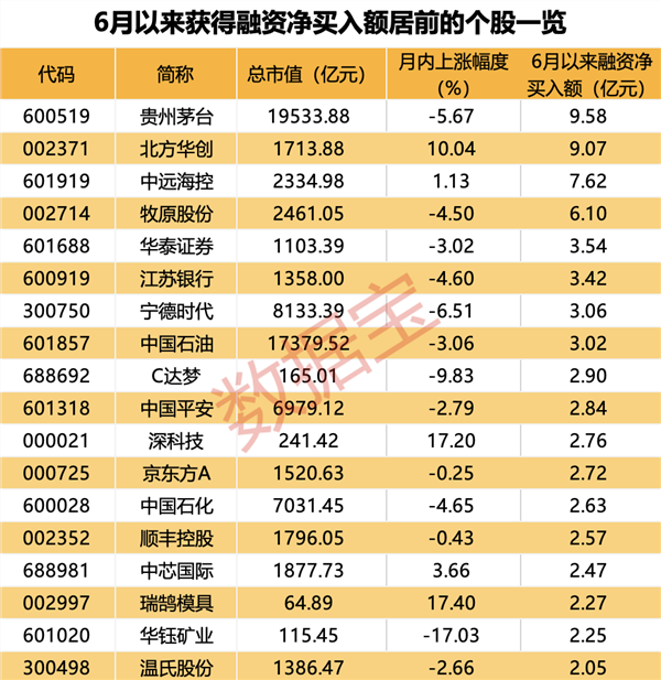 拉长时间区间来看,6月以来,41只个股获得融资净买入超亿元,贵州茅台、北方华创、中远海控、牧原股份的净买入额居前,均超6亿元。其中电子行业中,北方华创、深科技、京东方A、中芯国际、通富微电的融资净买入额居前,均超2亿元。