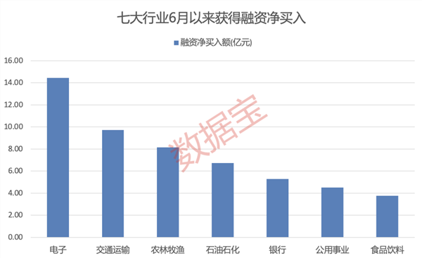 分行业统计,6月以来,申万所属一级行业有7个行业融资余额增加,电子行业融资余额增加最多,增加14.46亿元。融资余额增加居前的行业还有交通运输、农林牧渔、石油石化等,融资余额分别增加9.74亿元、8.15亿元、6.72亿元。