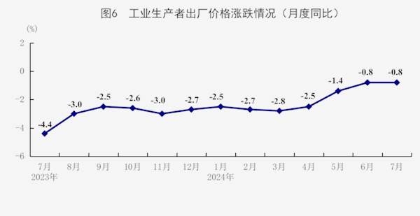 7月份,全国工业生产者出厂价格同比下降0.8%,环比下降0.2%;全国工业生产者购进价格同比、环比均下降0.1%。1-7月份,全国工业生产者出厂价格和购进价格同比分别下降2.0%和2.2%。