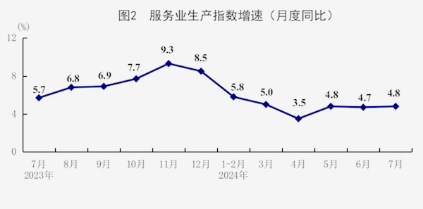 7月份,全国服务业生产指数同比增长4.8%,比上月加快0.1个百分点。分行业看,信息传输、软件和信息技术服务业,租赁和商务服务业,交通运输、仓储和邮政业,金融业生产指数同比分别增长12.6%、9.0%、5.3%、5.1%,分别快于服务业生产指数7.8、4.2、0.5、0.3个百分点。1-7月份,全国服务业生产指数同比增长4.9%。1-6月份,规模以上服务业企业营业收入同比增长7.2%。7月份,服务业商务活动指数为50.0%;服务业业务活动预期指数为56.6%。其中,铁路运输、航空运输、邮政、电信广播电视及卫星传输服务、文化体育娱乐等行业商务活动指数位于55.0%以上较高景气区间。