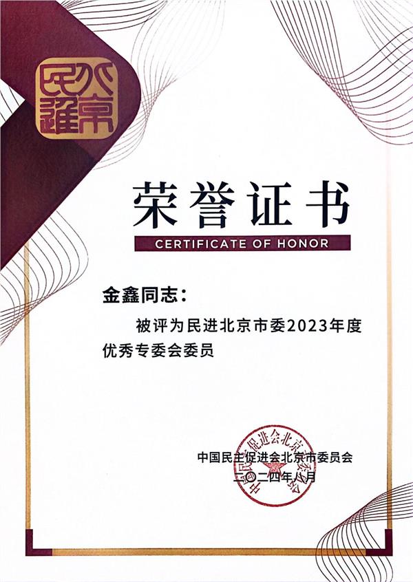 为进一步总结经验、肯定成绩、鼓励先进,根据各组织、各专委会和个人参政议政工作开展情况,经民进北京市委主委会审议通过,决定对优秀组织和个人及其成果予以表彰。其中,民进北京市第十六届委员会港澳台及海外联络委员会(下文简称“联委会”)获评“2023年度参政议政工作优秀专委会”,联委会副主任、学大教育集团创始人、董事长兼首席执行官金鑫获评“优秀专委会委员”。
