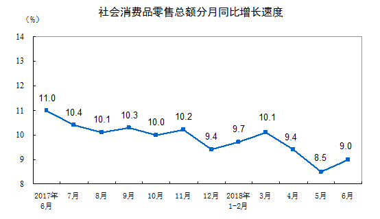 网络整理 2021-03-222018年6月份社会消费品零售总额增长9.0%