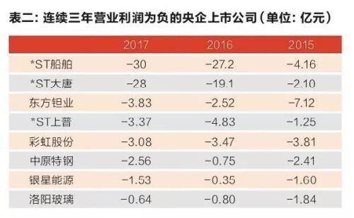 统计发现,有8家央企上市公司连续三年的营业利润为负(见表二)。