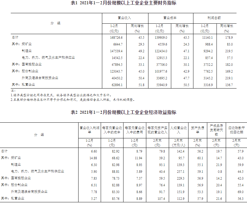 工业生产销售增长加快,带动盈利明显增加。年初以来,市场需求持续回暖,工业企业延续稳定恢复态势,生产销售较去年同期明显加快。1—2月份,规模以上工业增加值同比增长35.1%,两年平均增长8.1%;营业收入同比增长45.5%,两年平均增长9.4%。工业生产销售均达到近年较好水平,为企业效益改善创造有利条件。