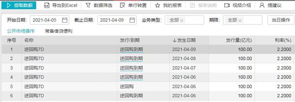 央行网站消息,为维护银行体系流动性合理充裕,2021年4月6日人民银行以利率招标方式开展了100亿元逆回购操作。
