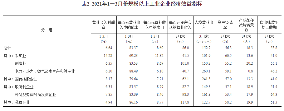 1—3月份,规模以上工业企业实现营业收入27.48万亿元,同比增长38.7%;发生营业成本22.91万亿元,增长36.5%;营业收入利润率为6.64%,同比提高2.76个百分点。
