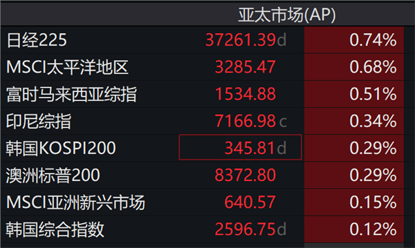 截至发稿,日经225指数、韩国KOSPI200指数涨幅分别为0.74%、0.29%。