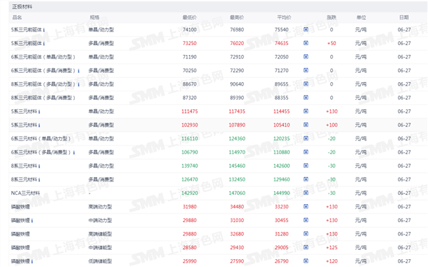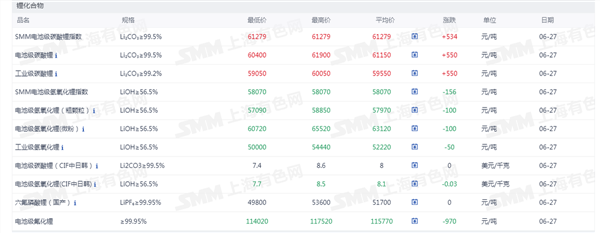 网络整理 2025-11-20证券之星新能源车行业周报:据上海有色网,截止6月27日,电池级碳酸锂6.04-6.19万元/吨,均价6.115万元/吨,环比上一工作日上涨550元/吨;工业级碳酸锂5.905-6.005万元/吨,均价5.955万元/吨,环比上一工作日上涨550元/吨,碳酸锂现货成交价格重心呈现震荡上行。当前碳酸锂市场仍延续供大于求的基本格局,供需矛盾依然突出。从供应端看,市场可流通货源充足,库存压力尚未得到有效缓解。近期碳酸锂价格的阶段性回升主要受宏观及市场情绪等外部因素驱动,而非基本面改善所致。需求侧方面,下游正极材料企业仍保持审慎的采购策略,以刚性需求采购为主,尚未出现明显的补库意愿,市场整体观望情绪浓厚。在此市场环境下,下游材料企业更倾向于通过长协加量的方式锁定采购成本,以确保原料供应的稳定性。