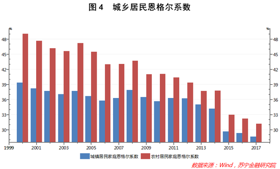 Wind数据显示,进入新世纪以来,我国城镇居民与农村居民的恩格尔系数在个别年份有所波动,但大体走势是下降的。尤其是自2012年起,城乡居民的恩格尔系数下降趋势更为明显。其中,城镇居民恩格尔系数由2012年的36.23%下降至2017年的28.6%,同期的农村居民恩格尔系数则由39.33%下降至31.2%(参见图4)。