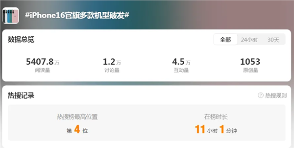 网络整理 2025-12-2610月21日,#iPhone16官旗多款机型破发#冲上热搜。在2024年“双11”电商节中,苹果发布仅1个月的iPhone 16系列全系迎来降价,这是新机发布以来官方渠道首次降价。