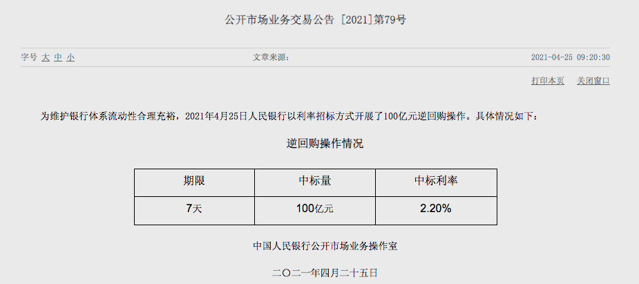 4月25日,中国央行表示,为维护银行体系流动性合理充裕,以利率招标方式开展了100亿元逆回购操作。