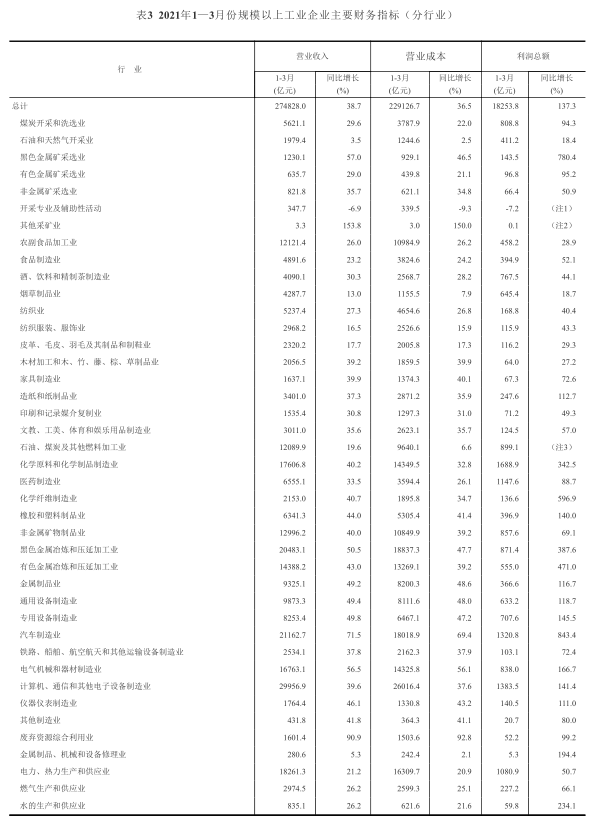 1—3月份,规模以上工业企业实现营业收入27.48万亿元,同比增长38.7%;发生营业成本22.91万亿元,增长36.5%;营业收入利润率为6.64%,同比提高2.76个百分点。