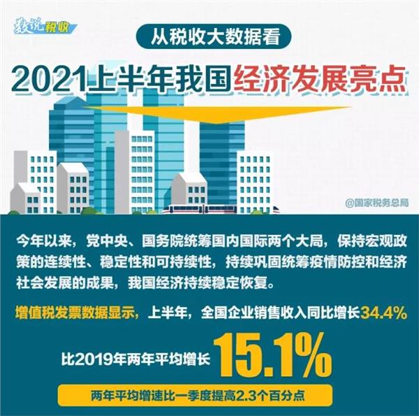 税务总局收入规划核算司副司长赵连伟介绍,增值税发票数据显示,上半年,全国企业销售收入同比增长34.4%,比2019年两年平均增长15.1%,两年平均增速比一季度提高2.3个百分点,反映出经济运行稳中加固、稳中向好。