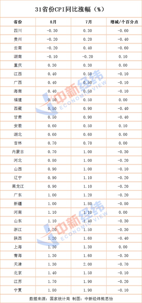 13日晚间,国家统计局公布31省份8月份居民消费价格指数(CPI),11省份同比涨幅低于全国平均水平,四川等4省份CPI同比下降。