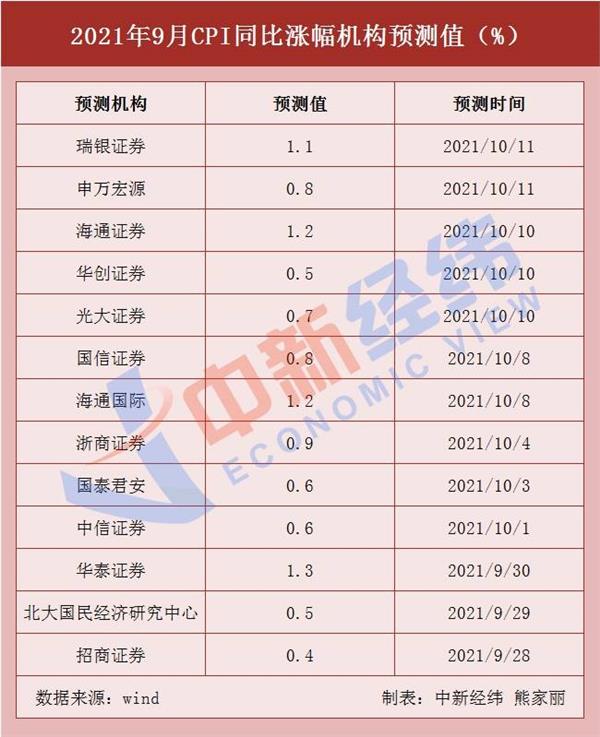 2021年1月,由于“春节错月”CPI同比涨幅由涨转降,随后四个月连续上升,增至5月的1.3%。6月,CPI同比涨幅回落,此后两个月连续下降,8月的CPI同比涨幅回落至0.8%。对于即将发布的9月CPI数据,截至10月13日,13家机构预测均值0.8%。其中,预测最大值为华泰证券的1.3%,最小值为招商证券的0.4%。
