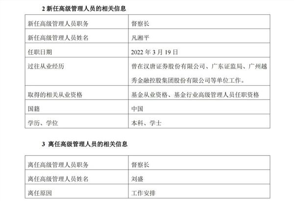 据悉,凡湘平曾在汉唐证券股份有限公司、广东证监局、广州越秀金融控股集团股份有限公司等单位工作。2022年3月19日起担任金鹰基金管理有限公司督察长。