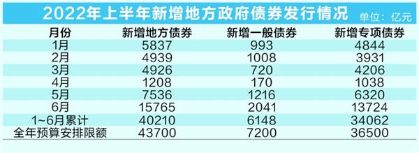 7月26日,财政部公布2022年6月地方政府债券发行和债务余额情况。数据显示,1~6月全国发行新增债券40210亿元,其中一般债券6148亿元、专项债券34062亿元。6月份,新增地方债尤其是新增专项债发行规模达到今年最高峰,分别为15765亿元和13724亿元。