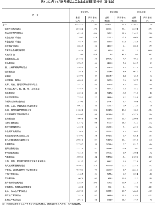 1—6月份,在41个工业大类行业中,16个行业利润总额同比增长,25个行业下降。主要行业利润情况如下:煤炭开采和洗选业利润总额同比增长1.57倍,石油和天然气开采业增长1.26倍,电气机械和器材制造业增长17.3%,有色金属冶炼和压延加工业增长16.6%,化学原料和化学制品制造业增长16.4%,专用设备制造业下降3.2%,纺织业下降5.3%,非金属矿物制品业下降5.8%,计算机、通信和其他电子设备制造业下降6.6%,农副食品加工业下降6.8%,通用设备制造业下降15.9%,电力、热力生产和供应业下降19.3%,汽车制造业下降25.5%,石油、煤炭及其他燃料加工业下降32.4%,黑色金属冶炼和压延加工业下降68.7%。