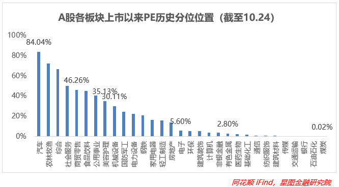 从上市以来板块分位值来看,截至10月24日收盘,大多数板块估值重新向下,前期估值跌幅较大的板块在最近估值有所修复,比如食品饮料、美容护理、机械设备等,上修幅度在20pct以上,而价值股、周期性行业则有所回调,包括旧能源、建材等,环比均-25pct。板块估值中位数为电子(5.60%)。
