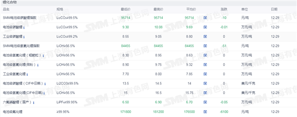 网络整理 2025-12-23证券之星新能源车行业周报:据上海有色网,截止12月29日,电池级碳酸锂9.3-10.08万元/吨,均价9.69万元/吨,环比上一工作日下滑0.01万元/吨;工业级碳酸锂8.55-9.05万元/吨,均价8.80万元/吨,环比上一工作日持平。临近年末,市场成交依旧维持清淡局面。当前贸易商因近期期现货价差扩大,进行持续期现货套利,对锂盐端采买需求小幅增加,而部分盐厂在期货价格相对较高的情况下,交仓意愿亦有所增强,供应端挺价情绪渐浓,市场维持弱稳局面。