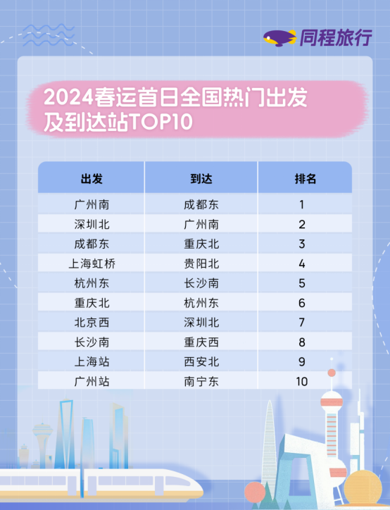 同程旅行春运大数据显示,春运首日以及第一周的客流结构主要以返乡过年的务工人员为主,流动方向主要是从东部城市、中心城市流向中西部地区,基本上北上广深及部分新一线城市是主要的出发地,贵州、四川、湖南、湖北、河南、陕西等则是重点到达地。除了长线出行外,长三角、珠三角及其他重点区域城市群之间的城际高铁线路的客流量也将显著增加,预计在除夕前2至3天达到客流高峰。