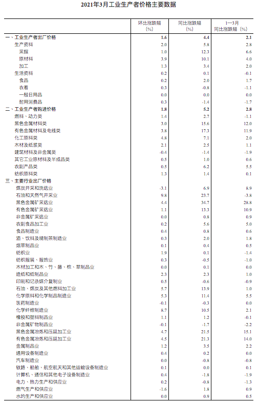 2021年3月份,全国工业生产者出厂价格同比上涨4.4%,环比上涨1.6%;工业生产者购进价格同比上涨5.2%,环比上涨1.8%。1—3月平均,工业生产者出厂价格比去年同期上涨2.1%,工业生产者购进价格上涨2.8%。